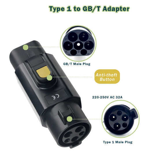Adaptador antirrobo de enchufe tipo 1 a GBT para coche eléctrico chino con cerradura, 32A, 220V, CA, 7,4kw, EV